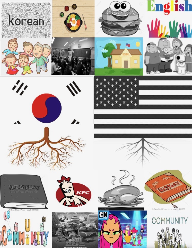 There are many parts that make up an identity. In this collage, I chose to pick out few aspects of where the crossing of two cultures can be seen in my life. For example, in this collage, there is a picture of the two languages, Korean and English. Korean is in the colors of black and white whereas English is represented with bright colors. This was intentionally done to deliver the idea that although, by blood, I am a Korean, the language that I speak is English. Language is a very important indicator of one’s culture and identity, which further explains the diffusion of both cultures in my life.