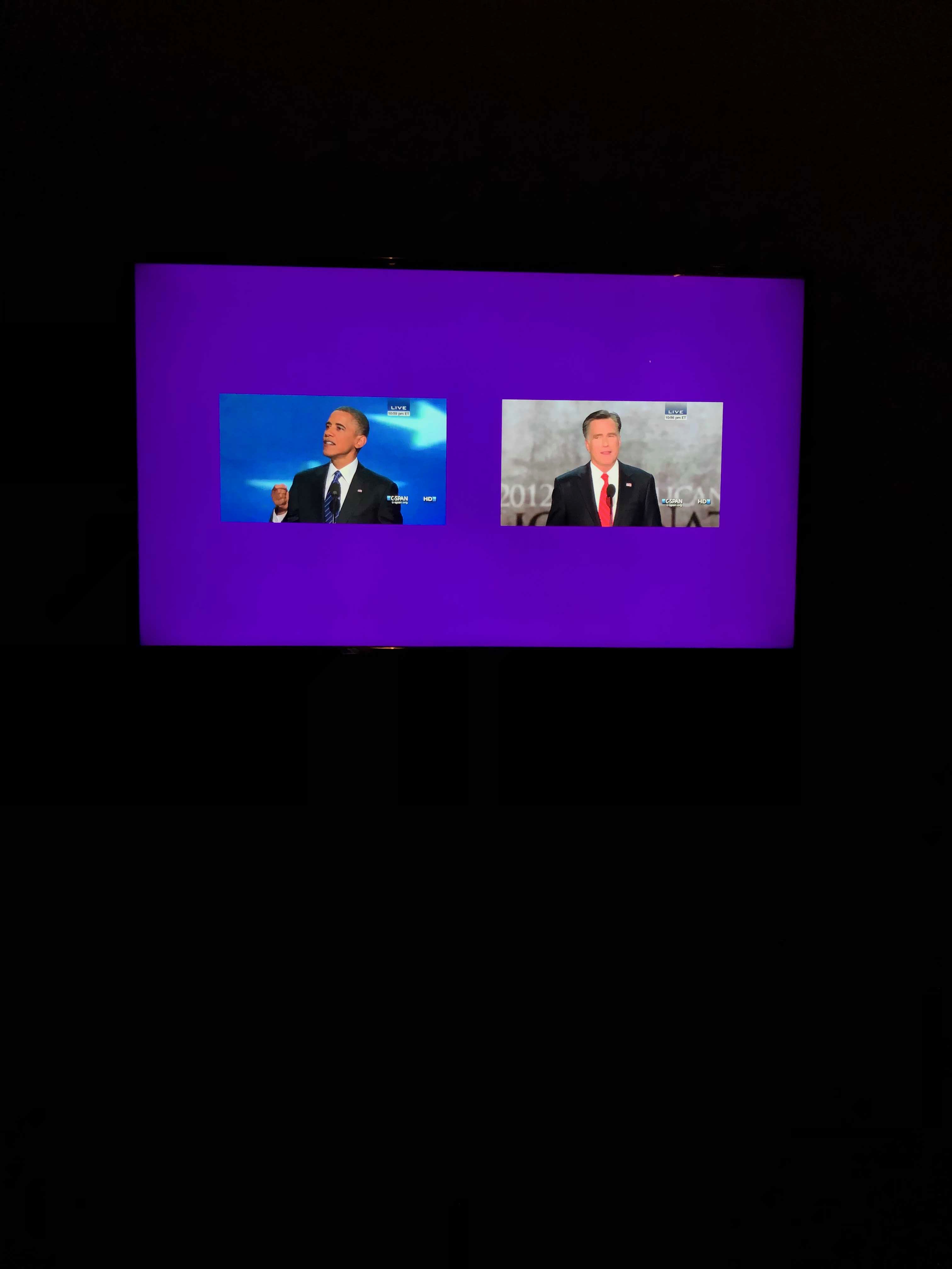 In Luke Dubois work, Acceptance, he uses the acceptance speech of two major-party presidential candidates given in the years of 2012 and 2016. The first screen depicts the video of the acceptance speech by President Obama and Governor Mitt Romney and the second screen shows former secretary Hillary Clinton and Donald Trump. This piece works to match the two candidates language so the speeches of the candidates may be conveyed in a synchronized pace. I believe this was done to show the viewers the difference in the candidates physical deliverance and tone rather than the words and meaning of the speech itself.