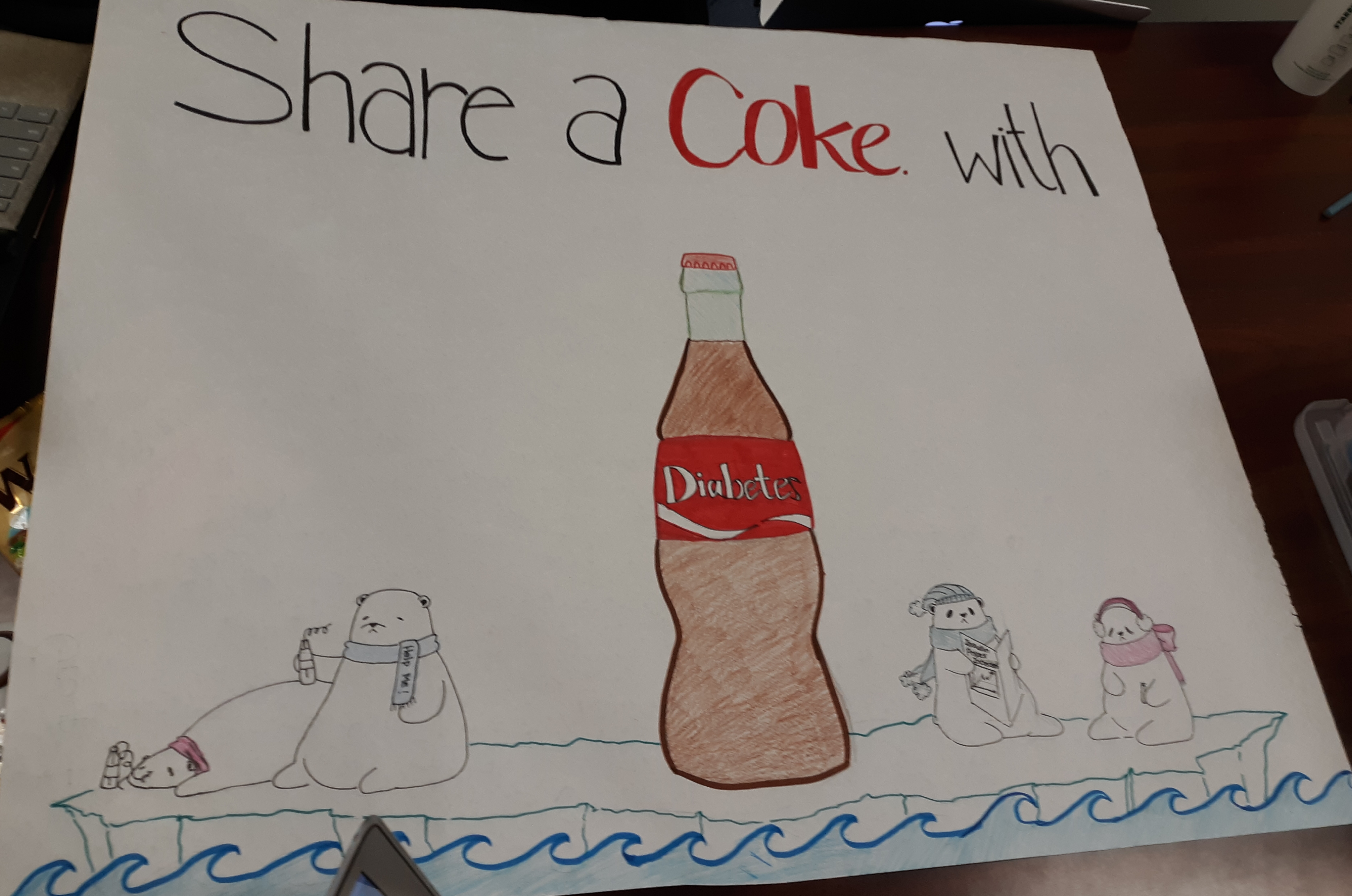 This spoof ad was to show the negative effects that coke can have on one’s health. Coke is a very common soft drink that is purchased in wide rates. Coke is sold anywhere you go and many consumers are not very aware of the negative effects that this drink can have one one’s body.  However, as this spoof ad shows, there are health risks that can result from this drink. The high rates of sugar, along with a lot other ingredients, that are contained in the small bottle of soda can actually lead to health issues such as diabetes. The polar bears in this ad are actually injecting insulin in their bodies. This is to create a sense of humor to the coke advertisement by relaying the message that one bottle of coke equates to diabetes. By stirring humour in this ad, I believe it can relay a strong message about health in a easy and friendly manner. It is also spreading more awareness about how one bottle of coke can affect one’s health.