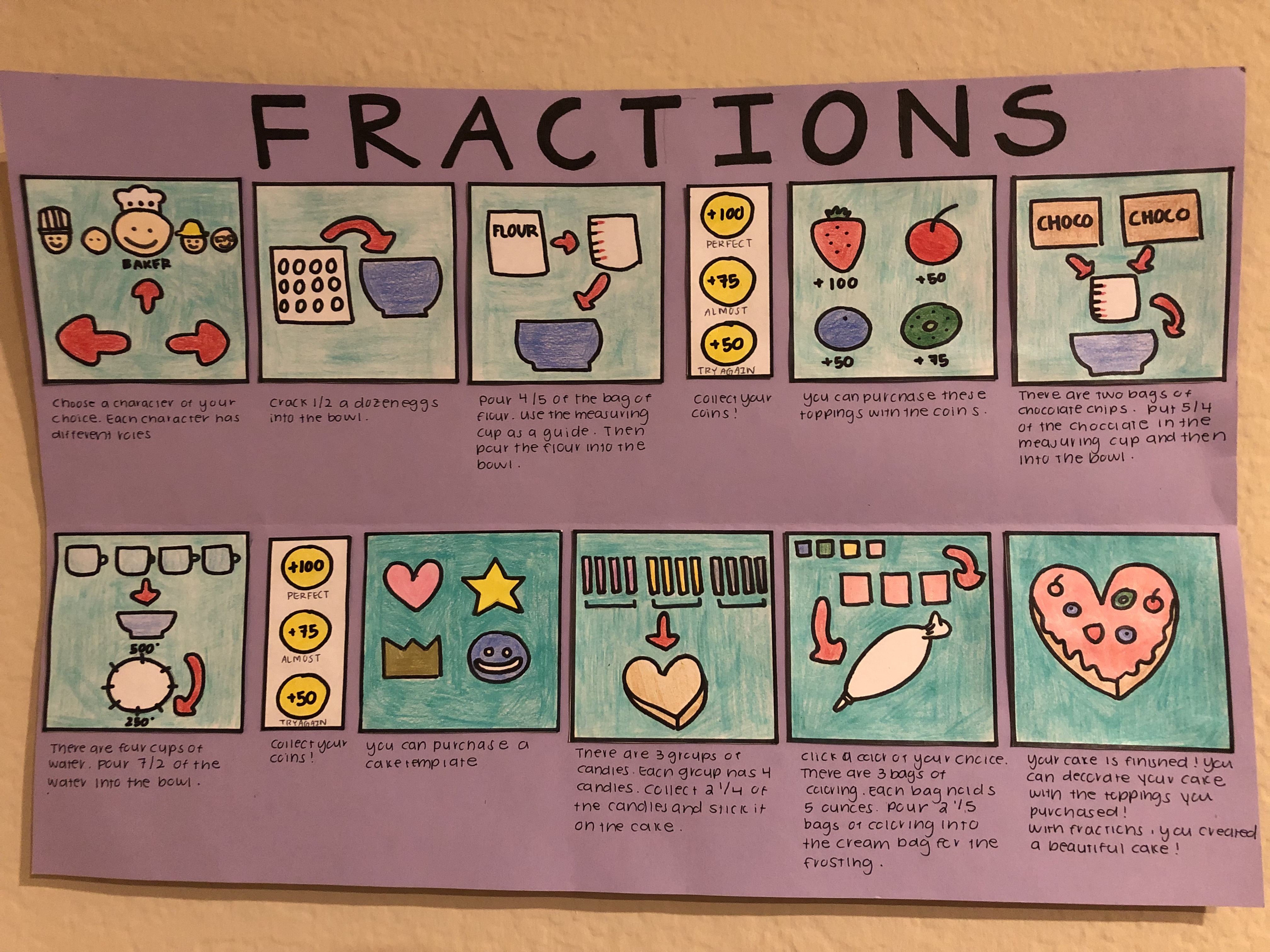 The video game storyboard will be targeted towards third grade students and will be focused on teaching fractions. This game will empower learning by allowing students to customize their own character which will give them the feeling of being in control. By choosing what characters they want to be, students will be able to try new skills, new goals, and new possibilities. They will see that that all characters in the game have different goals for their career but all require the knowledge of fractions, which will emphasize the importance and reason to why learning is necessary. The goals will be specifically stated for the character that they choose. For example, when students choose to play as a baker, the goal will be to bake a cake in the perfect temperature, shape, and proportion through the use of fractions.